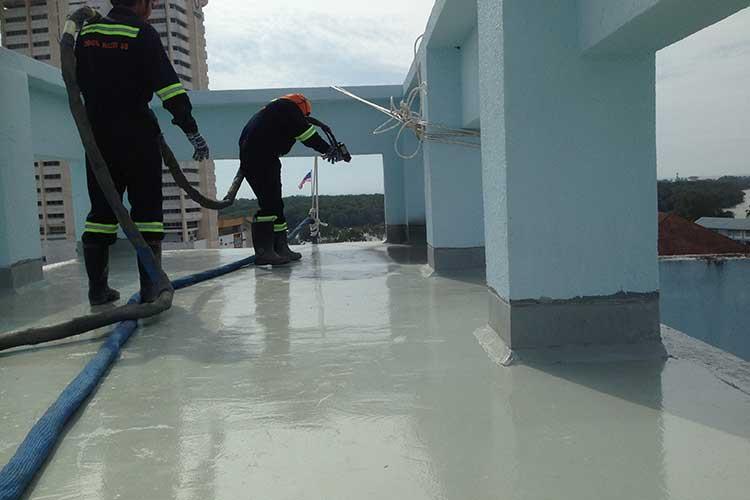 4、大規(guī)模噴涂之前,首先確定所有機(jī)械設(shè)備運(yùn)轉(zhuǎn)正常,確保A料內(nèi)不得有空氣進(jìn)入,B料攪拌均勻;噴涂時的室外溫都不低于5℃。噴涂前現(xiàn)在1㎡左右面積上進(jìn)行試噴,調(diào)整噴槍參數(shù),噴涂時也應(yīng)遵循先側(cè)墻后地面進(jìn)行噴涂施工,按順序噴涂,一道噴涂時要覆蓋上一道噴涂寬度的50%(俗稱“壓槍”),保證厚度大致均勻。合理調(diào)節(jié)噴槍的噴射角度和槍與基面的距離,可使表面光滑如“鏡面”,加強(qiáng)美觀。噴涂施工時,除注意壓槍和噴涂方向外,還要注意及時清理底材上未處理干凈的殘渣以及噴涂過程中落到底材上的雜物。側(cè)墻施工時需搭設(shè)臨時腳手架,注意對腳手架底部進(jìn)行保護(hù),避免將已成膜餓防水層硌破;當(dāng)兩次的噴涂間隔大于6小時,底涂應(yīng)留出20cm~25cm的距離以便與第二次底涂進(jìn)行搭接,底涂(膩?zhàn)樱┦┕たp搭接面操作時應(yīng)先將搭接面清理干凈,涂刷專門搭接劑方可進(jìn)行施工。在涂刷的施工中盡量避開炎熱和潮濕的天氣,涂刷后做好成品保護(hù),保證或適當(dāng)縮短其實(shí)干時間。